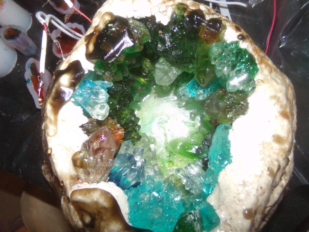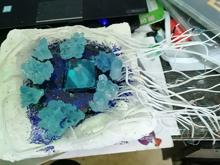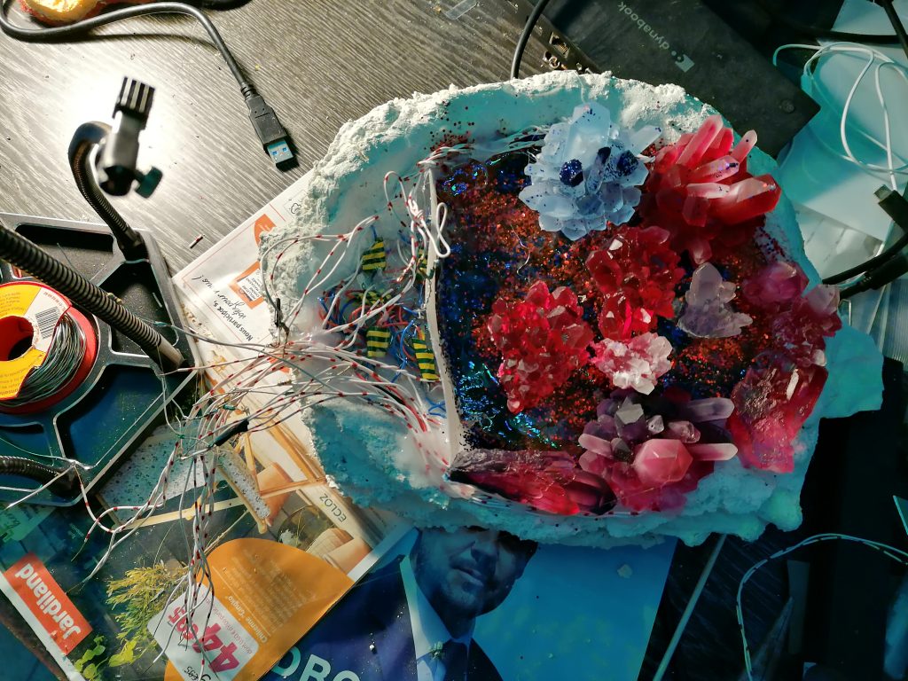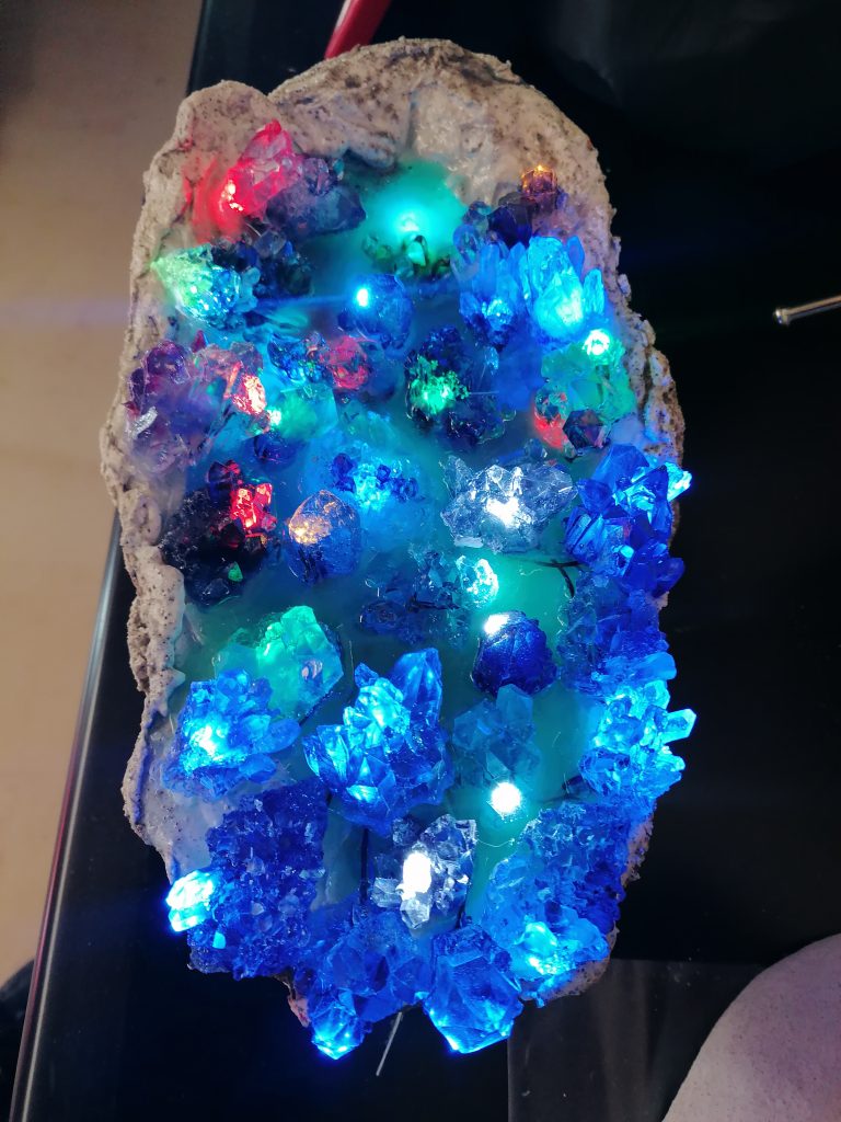 Les LEDs placées dans un trou creusé dans le cristal créent une colonne de lumière au centre du cristal. J’intègre les deux afin de donner des effets de lumières différents.