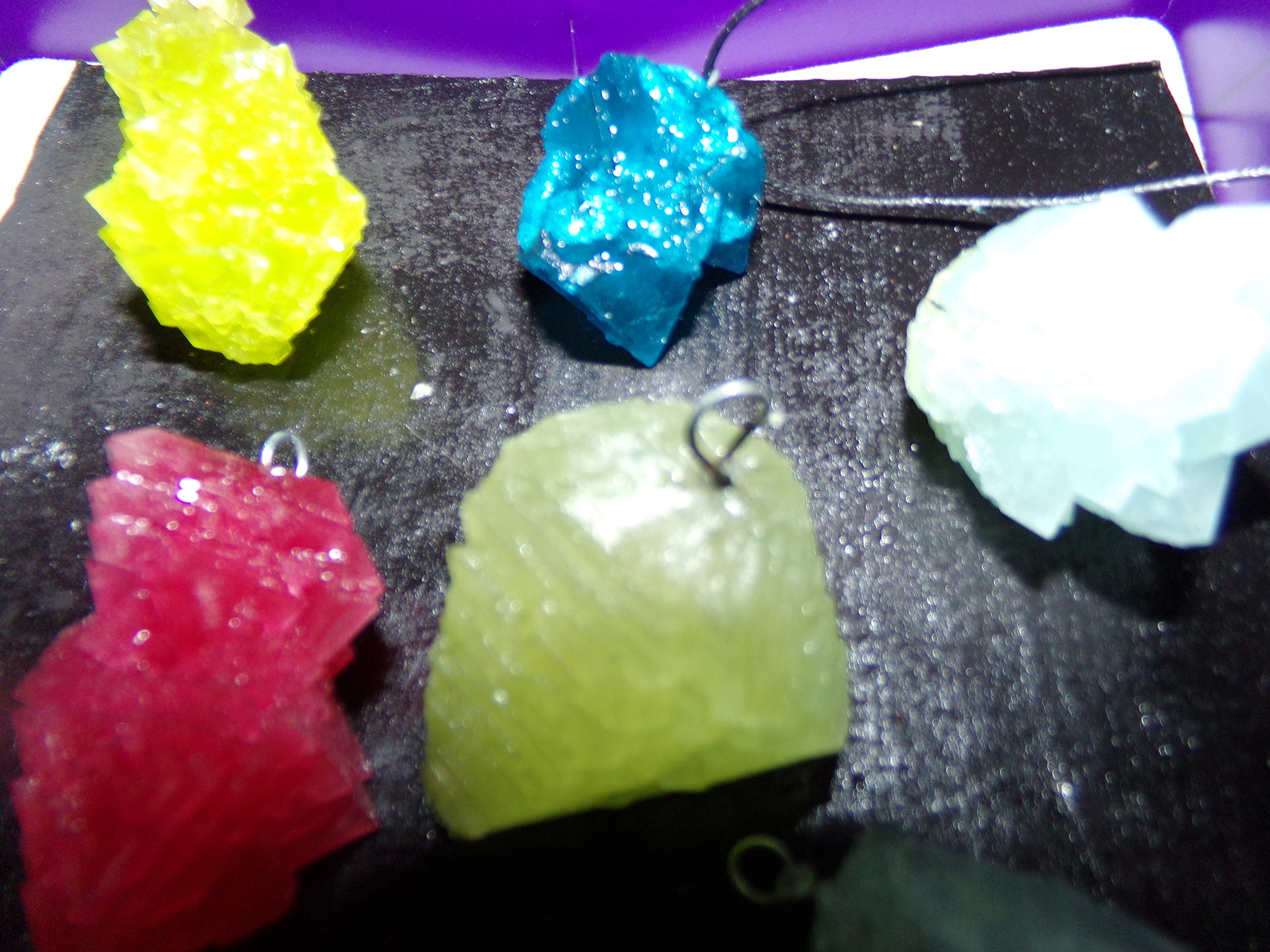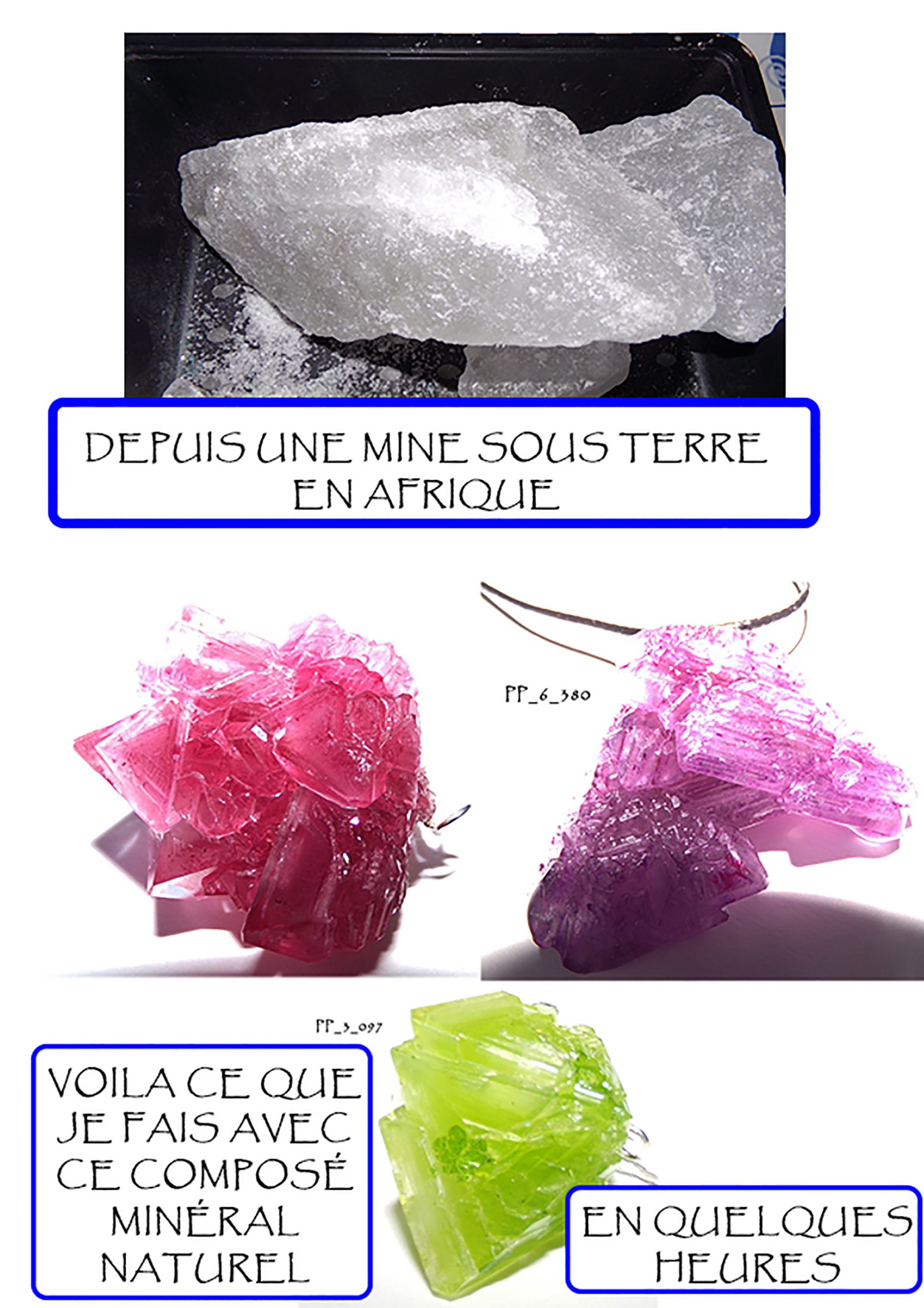 L’Alun est dilué dans de l’eau à une température de 80° centigrades. Un Solénoïde est plongé dans le liquide et, lors du refroidissement du liquide, le minéral cristallise selon un procédé exclusif. Des centaines de micro-pyramides se créent et s’assemblent de cette façon :