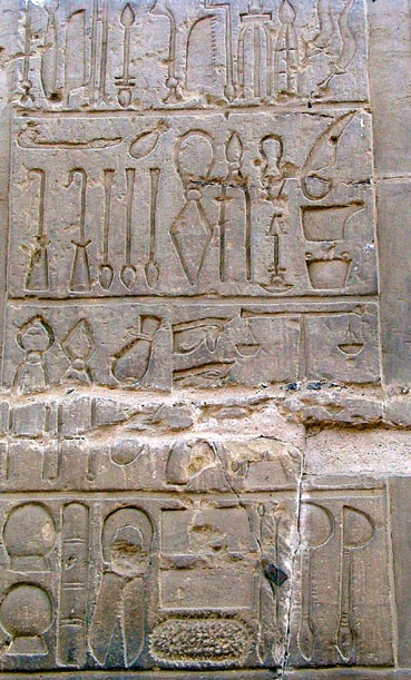 Sur le Site de Kom Ombo dans le Sud de l’Égypte est gravée une Stèle qui montre les instruments chirurgicaux utilisés en Égypte Antique :